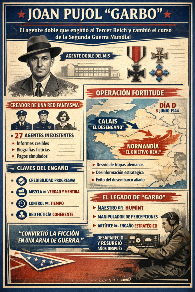 La historia del español Joan Pujol «Garbo» agente doble que trabajó para el MI5 inglés y resultó decisivo con su aportación para engañar a los alemanes del lugar exacto del desembarco por parte de las tropas aliadas, que finalmente se produjo en Normandía.